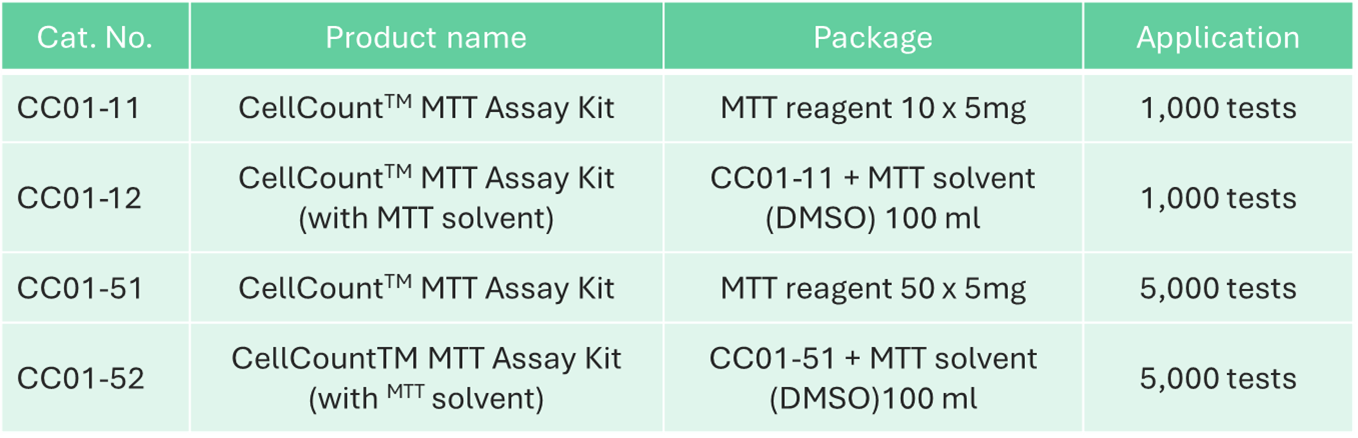 CellCountTM MTT Assay Kit is a colorimetric method for measuring the activity of enzymes in living cells through the reduction of MTT to formazan dyes. This non-radioactive and cost-effective method provides a reliable approach for measuring cell proliferation, viability, and cytotoxicity.